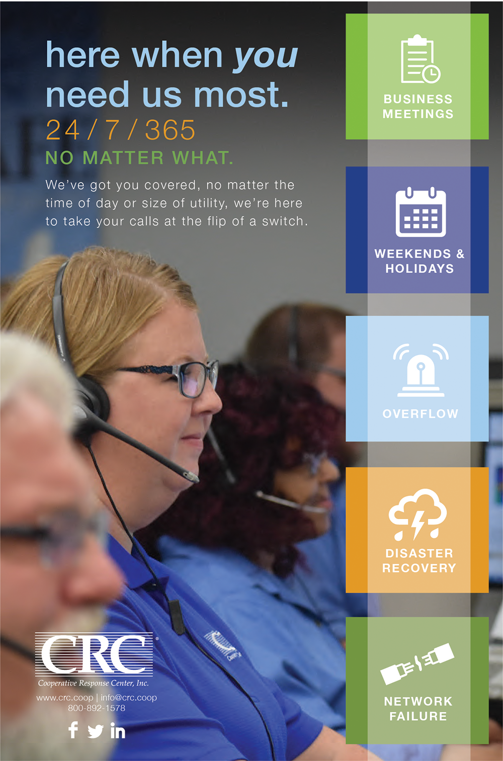 CRC offers utilities across the country seamless contact center and alarm monitoring solutions, including call management, line crew dispatch, AMI/CIS/OMS integration, CRCLink® outage communication software, and alarm monitoring. CRC also offers outage texting services, video monitoring of substations and a Payment Card Industry (PCI) compliance solution which utilizes live agents for billing calls. From outage calls to billing calls, disconnects to emergency locates and more, CRC is there for its membership 24/7/365. By partnering with CRC, members find peace of mind as well as a cost-effective solution to their call handling needs.